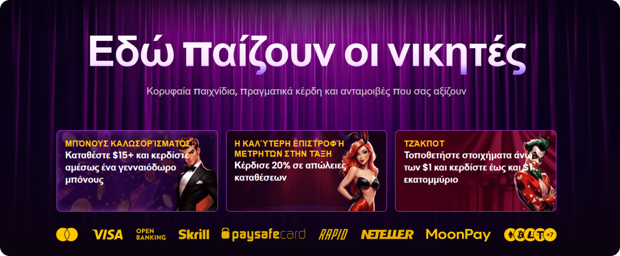Μέθοδοι κατάθεσης: Visa, MasterCard, Skrill, Neteller, MiFinity, Bitcoin, Ethereum, Tether, Litecoin, Dogecoin.